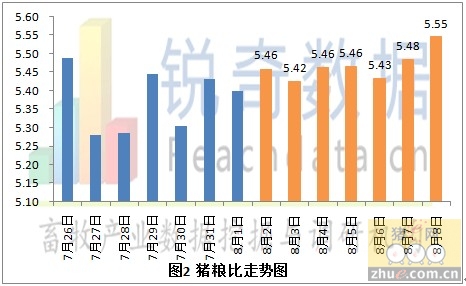 据锐奇数据监测的当地生猪报价信息统计,2012年8月9日全国各省生猪平均价格为13.97元/千克,较昨日(8月8日)上涨0.15元/千克,上涨幅度为1.08%,较上周同期(8月2日)上涨0.27元/千克,上涨幅度为1.97%。(见图1)今日猪粮比为5.55:1,较昨日上升0.07,涨幅为1.27%。较上周同期上涨0.15,涨幅为2.78%。(见图2)