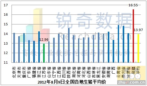8月9日生猪市场行情有所好转,全国各大城市仍然保持着生猪震荡的态势,全国生猪价格最高地区为新疆,生猪平均价为16.55元/千克,最低地区为江苏省,生猪平均价为12.96元/千克,两地区差异非常明显,南方价格弱势比较明显。