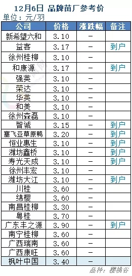 今年春节放假相对较早,进入12月冷藏停放期临近、屠宰端需求有限而各地出苗供给日渐增多,继上周末鸡苗暴跌之后、鸭苗价格亦全线跳水。其中12月1日出现巨幅波动,早间鸭苗厂家一次报价普跌0.4-0.8元/羽不等,但市场反应不明显、计划较差,至中午各大品牌厂随即二次下调报价,其中北方鲁豫皖苏地区鸭苗报价跌幅在3.2元/羽左右,华南两广及江西、四川等地主流孵化厂家价格下调2.2-2.3元/羽。单日价格暴跌幅度创年内之最!