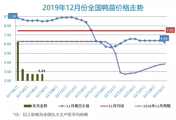 最新行情:明日全国鸭苗价格低位徘徊、止跌暂稳,各区域主流孵化厂家参考报价不动。全国监测区域鸭苗成交均价3.21元/羽,较去年12月同期下跌2.52元/羽,跌幅44.0%,环比11月下跌4.74元/羽。
