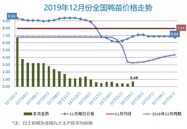 最新行情:明日全国鸭苗价格番麻补跌、白苗反弹。北方冷藏企业大分割逐渐恢复投放,小白条厂家仍处于停放阶段,苗厂顺势调价、试探上涨,明天北方鲁豫皖苏地区品牌苗厂报价上调0.3元/羽。南方两广、江西及四川地区价格联动上涨0.1-0.4元/羽不等。全国监测区域鸭苗成交均价0.68元/羽,较去年12月同期下跌5.05元/羽,跌幅88.1%,环比11月下跌7.27元/羽。