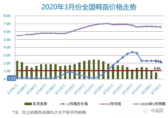 最新行情:明日全国鸭苗价格全线崩盘、轮动下跌,其中北方鲁豫皖苏及江西地区主流孵化厂家开票报价下调0.2-0.3元/羽,华南两广及四川维持暂稳。全国监测区域鸭苗成交均价0.81元/羽,较去年3月同期下跌5.52元/羽,跌幅87.2%,环比2月下跌0.24元/羽。