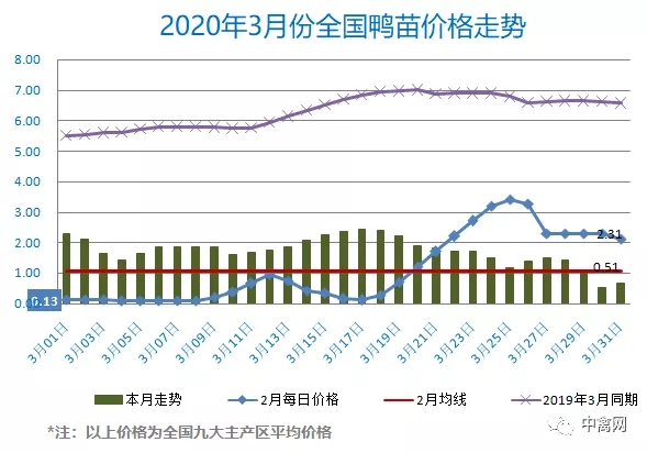 最新行情:明日上游端鸭苗、种蛋行情谷底徘徊、跌无可跌。上周末各地鸭苗大幅跳水后、全国苗价一度跌至0.5元/羽一线,目前北方冷藏端大分割厂家恢复投放、小白条合同已经停放较多,明天南方两广及四川维持暂稳,北方区品牌苗厂试探上调0.1元/羽。全国监测区域鸭苗成交均价0.73元/羽,较去年3月同期下跌5.67元/羽,跌幅89.6%,环比2月下跌0.39元/羽。