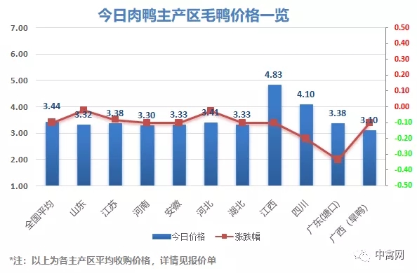 北方区冷藏企业以回收合同鸭为主,市场波动幅度较小,山东、河南等地毛鸭出栏价格在3.15-3.40元/斤区间。全国监测区域毛鸭收购均价3.44元/斤,较去年同期下跌0.55元/斤,跌幅13.9%。