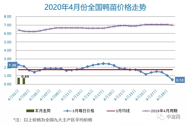 最新行情:明日全国鸭苗价格南跌北稳、低位下探,其中粤桂两广及四川地区主流孵化厂家开票报价下调0.1-0.2元/羽,北方区维持暂稳。上周末各地鸭苗大幅跳水后、全国苗价一度跌至0.5元/羽一线,目前北方冷藏端大分割厂家恢复投放、小白条合同仍停放较多。华南市场两广大鸭近期断崖式暴跌,短短两周时间出栏价格已经腰斩,严重挫伤养殖户补栏积极性。全国监测区域鸭苗成交均价0.69元/羽,较去年4月同期下跌6.02元/羽,跌幅89.7%,环比3月下跌1.04元/羽。