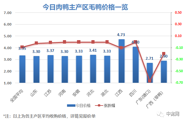 4月1日全国商品鸭出栏价格崩盘跳水、两广断崖式下跌。其中广东地区今天冷藏厂及收购商采购报价下滑0.6-0.7元/斤,创下2020年以来最大单日跌幅,目前各地白鸭主流成交价跌至2.6-2.8元/斤。广西方面水、旱鸭装车价下滑0.2-0.5元/斤不等。中南江西、湖南等地行情亦联动回落。