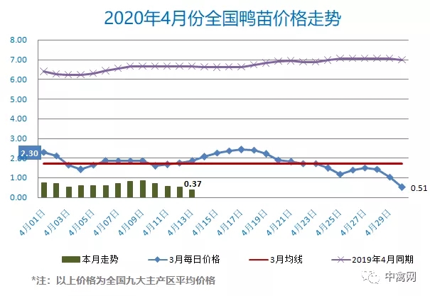 3月下旬以来南方活禽区域过山车行情再现,广东大鸭暴涨暴跌,当前平均出栏价格已回落至2.53元/斤,较3月份高点腰斩过半,一线养殖补栏积极性遭到严重挫伤。全国监测区域鸭苗成交均价0.37元/羽,较去年4月同期下跌6.34元/羽,跌幅94.5%,环比3月下跌1.36元/羽。