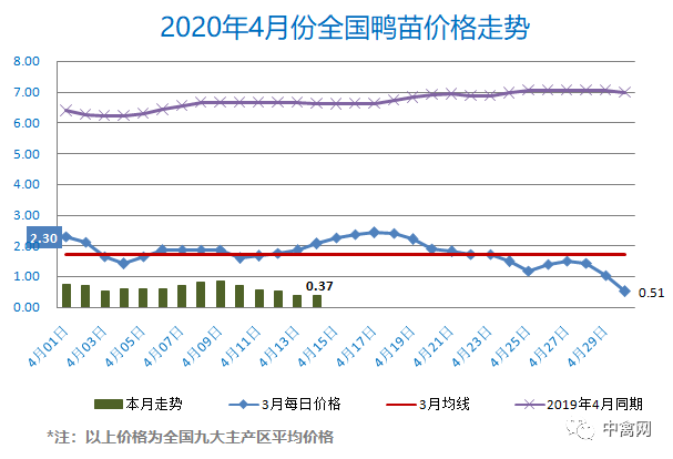 3月下旬以来南方活禽区域过山车行情再现,广东大鸭暴涨暴跌,当前平均出栏价格已回落至2.53元/斤,较3月份高点腰斩过半,一线养殖补栏积极性遭到严重挫伤。全国监测区域鸭苗成交均价0.37元/羽,较去年4月同期下跌6.34元/羽,跌幅94.5%,环比3月下跌1.36元/羽。
