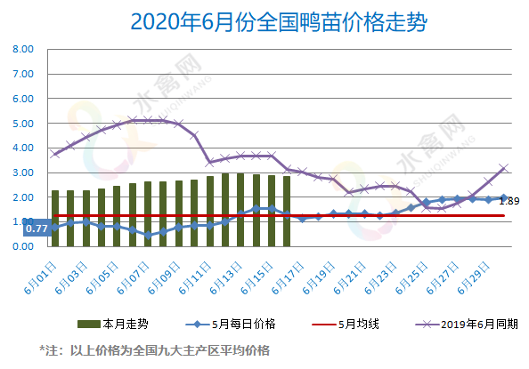 最新行情:明日全国鸭苗价格整体暂稳、横盘运行,除江西小幅下调外、其他区域主流孵化厂家开票报价维持暂稳。全球疫情加速恶化,北京新发地检出病毒事件将成为影响下半年行情的重大变动因素、也将成为影响冰鲜品进程、以及肉类进出口等的标志性事件。全国监测区域鸭苗成交均价2.85元/羽,较去年6月同期下跌0.50元/羽,跌幅14.9%,环比5月上涨1.60元/羽。