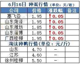 6月15日全国商品鸭出栏价格利空连击、全线回落。上周以来我国东南大范围区域强降雨天气不断,广东、广西、江西、江苏等地先后出现洪涝灾害。今天两广大鸭行情继续高位回落、震荡下滑,各地大鸭收购价普跌0.1-0.3元/斤不等。目前广东白鸭主流成参考3.80-3.90元/斤,泥鸭厂家采购价格4.4元/斤。