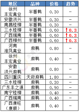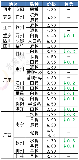 | 广西 | 南宁(水鸭) | 4.70 | -0.30 |