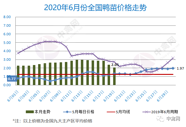 最新行情:明日上游端鸭苗、种蛋行情延续下行、全线重挫。其中北方苗厂在计划放缓后坚持挺价策略、连续一周死守3元位,致使市场鸭苗量价扭曲,各地纷纷高报低走、价格失真。明天各区域主流孵化厂家开票报价普跌0.3元/羽,南苗价格再度跌破2元。全国监测区域鸭苗成交均价2.05元/羽,较去年6月同期下跌1.30元/羽,跌幅38.8%,环比5月上涨0.79元/羽。