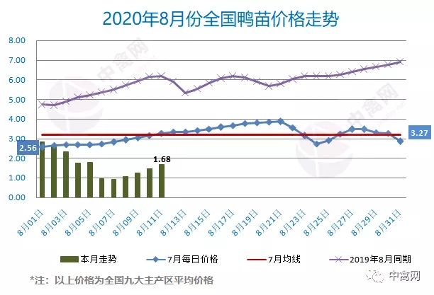 最新行情:明日全国鸭苗价格全线飘红、反弹连涨,各区域主流孵化厂家开票报价普涨0.2-0.3元/羽。8月台风、暴雨极端天气频发,近期的雨势中河南南部、安徽北部局地洪涝严重,加之跌入毛苗后孵化厂家惜售,挺价上涨。南方市场临近中秋国庆双节补栏鸭,养殖户上雏积极、苗厂地销计划顺畅。全国监测区域鸭苗成交均价1.68元/羽,较去年8月同期下跌4.19元/羽,跌幅71.4%,环比7月下跌1.53元/羽。