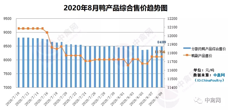 8月10日监测数据,目前鸭分割产品综合售价参考8489元/吨,环比7月下跌128元,跌幅1.49%;鸭副产品售价11756元/吨,环比6月下跌1.07%。本月鸭产品价格运行趋势图如下: