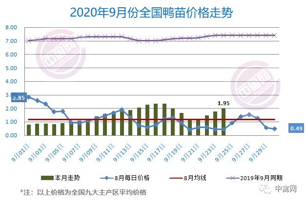 最新行情:明日上游端鸭苗、种蛋行情翻红上涨、节节上扬,各区域主流孵化厂家开票报价普涨0.2元/羽。进入中旬以来,国内禽肉市场整个产业链价格持续回落,明跌暗降、低位徘徊。尤其是上游端鸡苗鸭苗价格在国庆中秋双节前先后迎来惨烈调整、巨幅跌落。目前山东市场鸡苗价格毛苗探底,鸭苗亦险收1元位。全国监测区域鸭苗成交均价1.95元/羽,较去年9月同期下跌5.29元/羽,跌幅75.8%,环比8月上涨0.77元/羽。