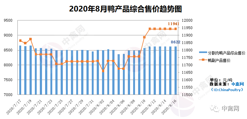 9月24日中禽网监测数据,目前鸭分割产品综合售价参考8622元/吨,环比8月基本拉平;鸭副产品售价11941元/吨,环比8月上涨0.49%。本月鸭产品价格运行趋势图如下:(待更新)