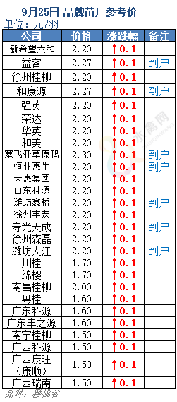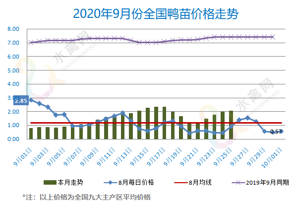 最新行情:明日上游端鸭苗、种蛋行情蛋稳苗涨、试探上扬,各区域主流孵化厂家开票报价小幅上调0.1元/羽。进入中旬以来,国内禽肉市场整个产业链价格持续回落,明跌暗降、低位徘徊。尤其是上游端鸡苗鸭苗价格在国庆中秋双节前先后迎来惨烈调整、巨幅跌落。目前山东市场鸡苗价格毛苗探底,鸭苗亦险守1元位。全国监测区域鸭苗成交均价2.05元/羽,较去年9月同期下跌5.19元/羽,跌幅75.8%,环比8月上涨0.87元/羽。