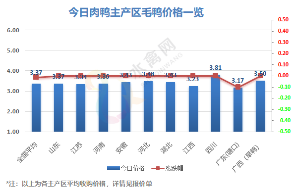 南方活禽区域震荡跌落、广东下滑,今天广东各地厂家及经纪人采购报价普跌0.1元/斤,白鸭主流成交参考3.0-3.3元/斤;广西方面初步止跌,水、旱鸭报价不动。(详情见正文内附表)。全国监测区域毛鸭收购均价3.37元/斤,较去年同期下跌0.55元/斤,跌幅13.7%。