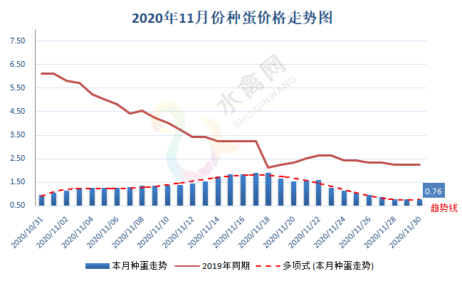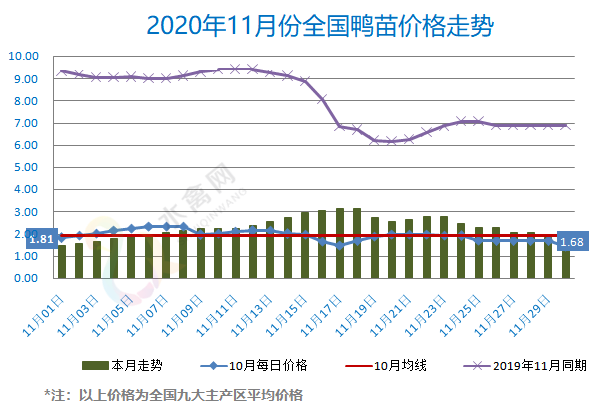 最新行情:明日全国鸭苗行情挺价控盘、权重拉升,除南方广西价格暂稳外,其他区域主流孵化厂家参考报价普涨上调0.1元/羽。全国监测区域鸭苗成交均价1.88元/羽,较去年11月同期下跌6.11元/羽,跌幅77.3%,环比10月下跌0.03元/羽。