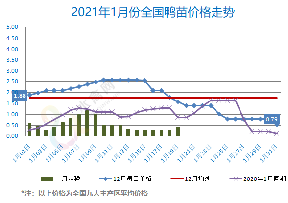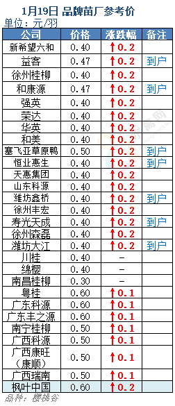最新行情:明日上游端鸭苗、种蛋行情止跌反弹、起量回升,北方鲁豫皖苏及南方两广地区主流孵化厂家参考价格上涨0.1-0.2元/羽不等。上周末开始,各地苗厂逐步恢复出苗,随着山东、江苏等地规模冷藏企业节后合同鸭投放的增加,孵化企业订单计划好转。全国监测区域鸭苗成交均价0.40元/羽,较去年1月同期下跌0.56元/羽,跌幅58.3%,环比12月下跌1.34元/羽。