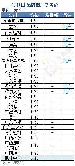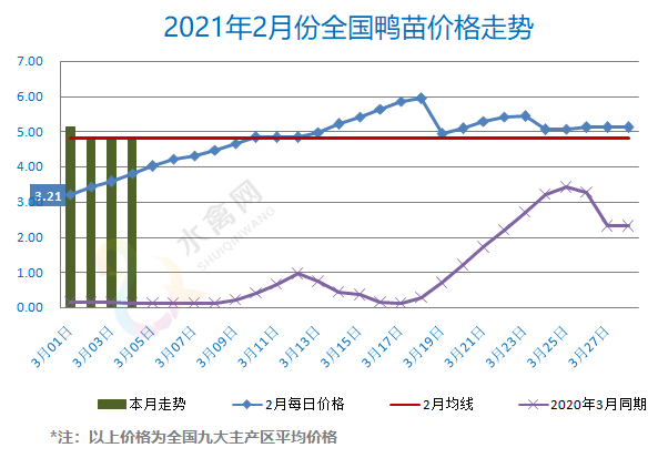 但随着各厂家的恢复出孵,量价背离、一骑绝尘的苗价也面临着理性回归。全国监测区域鸭苗成交均价4.70元/羽,较去年3同期上涨3.66元/羽,涨幅323.9%,环比2月略有下滑。