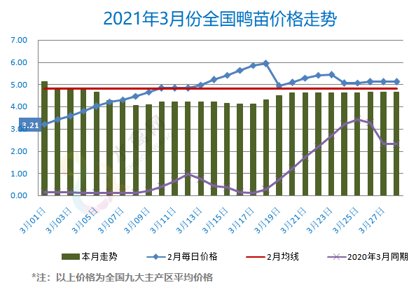 最新行情:明日上游端鸭苗、种蛋行情延续拉锯僵持、横盘态势,各区域主流孵化厂家参考报价不动。全国监测区域鸭苗成交均价4.66元/羽,较去年3同期上涨3.53元/羽,涨幅309.8%,环比2月下滑0.16元/羽。