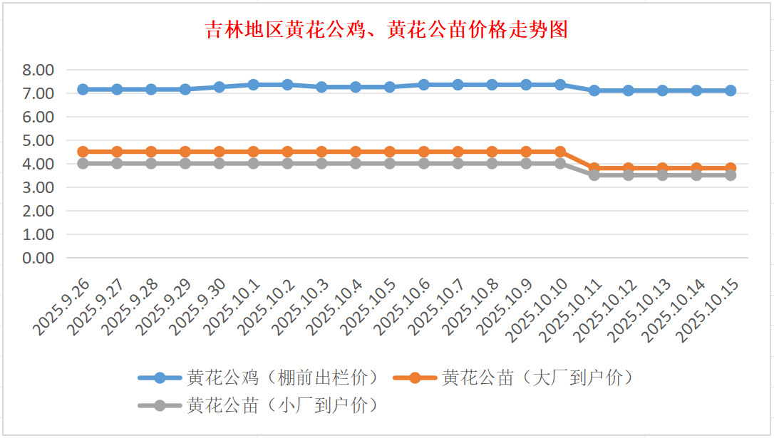 黄花公苗:价格稳定,大厂到户价3.80元/羽,小厂到户价3.50元/羽,稳。