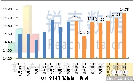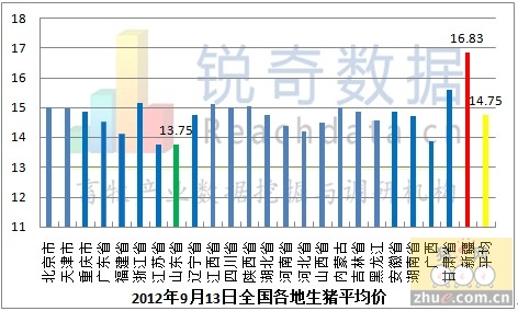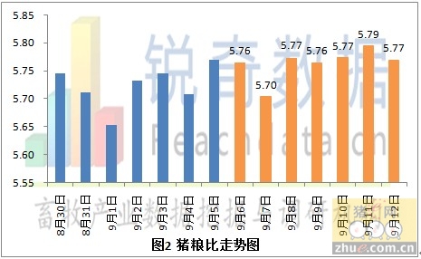 据锐奇数据监测的当地生猪报价信息统计,2012年9月13日全国各省生猪平均价格为14.75元/千克,较昨日(9月12日)上涨0.06元/千克,上涨幅度为0.41%,较上周同期(9月6日)上涨0.1元/千克,上涨幅度为0.68%。(见图1)今日猪粮比为5.77:1,较昨日下跌0.02,跌幅为0.35%。与上周同期(9月6日)持平。(见图2)