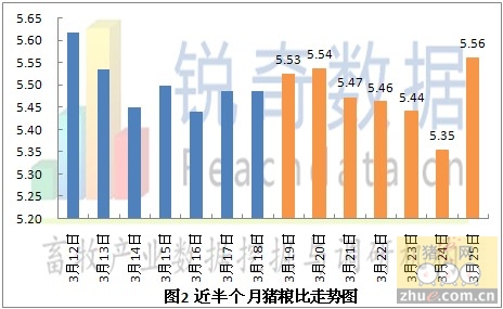 据锐奇数据监测的当地生猪报价信息统计,2013年03月26日全国各省生猪平均价格为13.09元/千克,较昨日上涨0.31元/公斤,涨幅为2.43%,较上周同期(3月19日)上涨0.16元/千克,涨幅为1.24%,今日猪粮比为5.56:1,较昨日上涨0.21,涨幅为3.93%,较上周同期(3月19日)上涨0.07,涨幅为1.28%(见图2)。