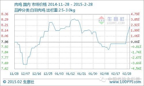 2月全国肉鸡价格呈现节前落节后涨的局势,月初参考均价为8.12元/吨,月末参考价格8.20元/吨,跌幅0.99%。