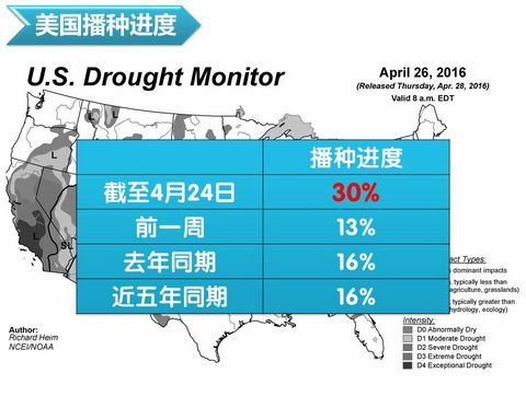 玉米只要在种,就必然要看天气的脸色。目前南北美就处在焦灼的天气之争中。美国的种植正在跟天气赛跑,趁着前段时间比较干燥,农民们抢先播种,报告显示,截至4月24日,美国18个玉米主产州的播种进度为30%,高于前一周的13%和去年同期的16%,也高于过去五年同期平均水平,赶超程度可见一斑。