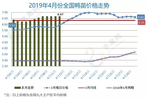 3月下旬鸡苗、鸭苗相继冲高回落,出现了阶段性下跌调整。但如前期所述,2018年下半年以来的非洲猪瘟持续肆虐,国内养猪大省、各大生猪主产区域相继沦陷,猪肉减产成为定局。业内看好禽肉市场的替代性增长,加之肉鸭的集中化、规模化、产业化发展,屠宰新增产能显著,使得对原料的需求同步增加,商品苗供给处于紧平衡状态,尽管鸭苗价出现了适度的回调,但整体价格表现来看、依然维持在中高位运行。
