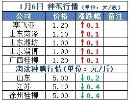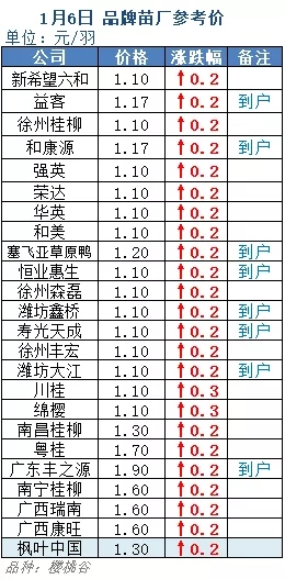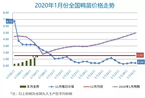 最新行情:明日上游端鸭苗、行情全线飘红、苗蛋齐升。各区域主流孵化厂家参考报价上调0.2-0.3元/羽不等。目前北方冷藏屠宰端分割及小白条厂家合同投放全线恢复,孵化企业顺势调价、小幅拉涨。全国监测区域鸭苗成交均价1.18元/羽,较去年1月同期下跌2.23元/羽,跌幅65.4%,环比12月下跌0.34元/羽。