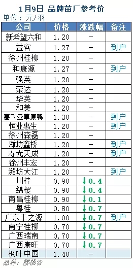最新行情:明日全国鸭苗价格两广大跌、南苗跳水,受活禽区域大鸭暴跌影响(目前广东地区白鸭出栏均价已下跌至2.21元/斤),养殖一线深陷巨额亏损、无心上雏补栏,明天两广品牌苗厂开票报价大幅下调0.7元/羽,中南江西及四川、重庆等地亦联动回落,跌幅0.1-0.4元/羽,北方市场暂稳。全国监测区域鸭苗成交均价1.09元/羽,较去年1月同期下跌2.32元/羽,跌幅68.0%,环比12月下跌0.43元/羽。