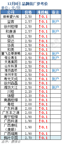 12月7日全国商品鸭出栏价格南方两广止跌,山东局部微降。本周以来,受进口肉冷链问题、集中监管检测等影响,冻品市场依然处于整理消化阶段,各地批发市场经销商普遍观望情绪,规模冷藏企业出货放缓、未有明显好转。原料方面北方毛鸭价格震荡跌落,目前鲁豫皖苏地区厂商收购价参考3.55-3.80元/斤区间。