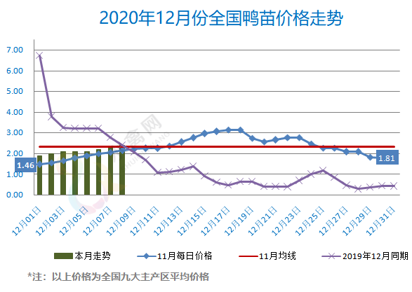 最新行情:明日上游端鸭苗、种蛋行情抱团挺价、小幅上扬,各区域主流孵化厂家开票报价普涨0.1元/羽。种蛋方面由于处于停止上孵、规避春节假期阶段,价格依然维持在低位。全国监测区域鸭苗成交均价2.38元/羽,较去年12月同期上涨0.86元/羽,涨幅56.6%,环比11月上涨0.07元/羽。