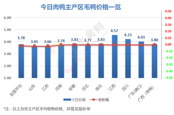 经历上周以来的下调整理后,两广地区白鸭初步企稳,泥鸭有0.2元/斤左右的补跌。目前广东白鸭主流成交参考3.9-4.3元/斤,泥鸭厂商采购指导价4.4元/斤左右。广西方面今天水鸭下滑0.2元/斤,装车价4.6元/斤,旱鸭收购价3.8-4.1元/斤,暂稳。(详情见附表)全国监测区域毛鸭收购均价3.78元/斤,较去年同期下跌0.37元/斤,跌幅8.8%。