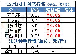 12月13日全国商品鸭出栏价格跳涨拉升、南涨北稳。其中南方广东、江西今天大涨0.3元/斤、强势反弹,目前广东各地白鸭主流成交价回升至4.5-4.8元/斤。广西方面水鸭持稳,南宁、钦州旱鸭有小涨。全国监测区域毛鸭收购均价3.81元/斤,较去年同期下跌0.35元/斤,跌幅8.4%。