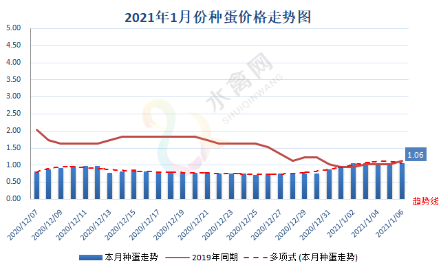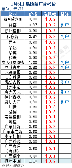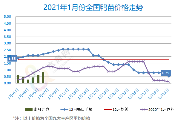 最新行情:明日全国鸭苗价格触底反弹、普涨回升,各区域主流孵化厂家开票报价上调0.1-0.3元/羽不等。由于冷藏合同大部停放,市场整体无量运转,上周以来价格持续毛苗低谷徘徊,局地厂家鸭苗打包、白送再现。全国监测区域鸭苗成交均价0.81元/羽,较去年1月同期下跌0.15元/羽,跌幅15.6%,环比12月下跌0.93元/羽。
