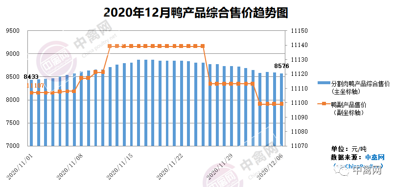 1月5日监测数据,目前鸭分割产品综合售价参考8576元/吨,环比11月下跌1.50%;鸭副产品售价11099元/吨,环比上月微跌0.23%。本月鸭产品价格运行趋势如下:(定期更新)
