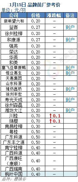 1月14日全国商品鸭出栏价格南强北稳、区域反弹。其中南方活禽区域延续反弹态势、价格普涨,今天两广、江西、湖北地区厂家及经纪人采购报价涨幅在0.1-0.2元/斤不等,目前广东白鸭成交参考5.0-5.3元/斤区间,广西方面水、旱鸭装车价分别在5.4和5元/斤,全线收复5元。泥鸭厂商采购价格参考5.2-5.5元/斤区间。