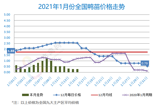 最新行情:明日上游端鸭苗价格底部震荡、毛苗徘徊,除西南四川价格上调0.1元/羽外、其他区域主流孵化厂家开票报价不动。全国监测区域鸭苗成交均价0.26元/羽,较去年1月同期下跌0.71元/羽,跌幅74.0%,环比12月下跌1.49元/羽。