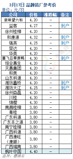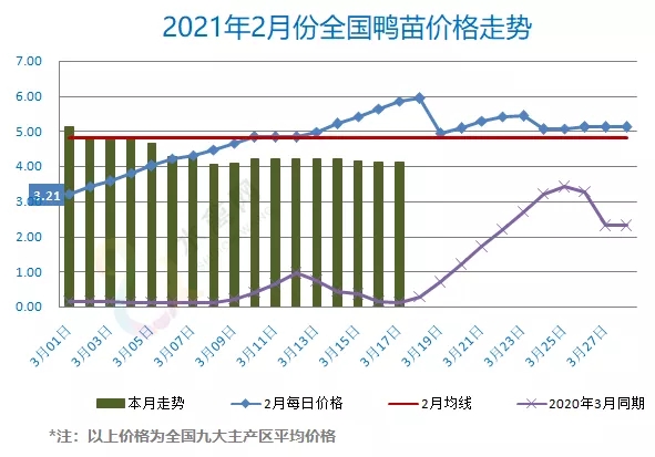 最新行情:明日上游端种蛋延续小涨,鸭苗横盘震荡,各区域主流孵化厂家参考报价不动,目前北苗已连续一周维持横盘态势。全国监测区域鸭苗成交均价4.11元/羽,较去年3同期上涨2.98元/羽,涨幅263.7%,环比2月下滑0.71元/羽。