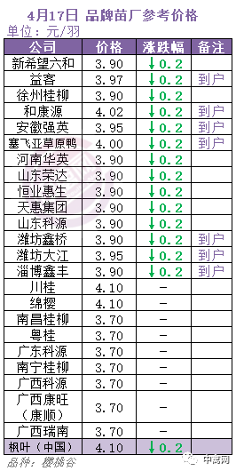 其他品种方面,麻苗低位下探、再度跌落,今天各厂家麻鸭发苗价下调0.1-0.2元/羽,番鸭、泥鸭苗暂稳。今年春节后饲料本就持续高位,叠加近期成品鸭行情跌落、极大挫伤一线养殖户上苗积极性。目前麻苗已陷入跌无可跌的毛苗低谷,各厂家报价参考0.4-1.6元/羽区间,泥鸭苗跌至1字头维持低位震荡。