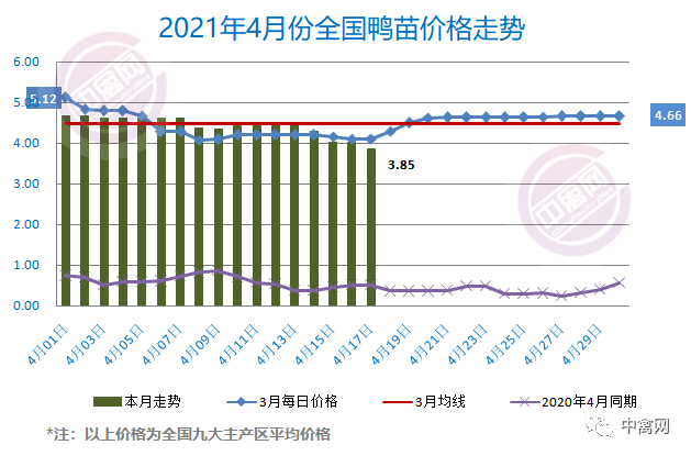 最新行情:明日上游端鸭苗、种蛋(品种:樱桃谷)行情区域变盘、北跌南稳,其中北方鲁豫皖苏地区品牌苗厂开票报价普跌0.2元/羽,华南两广、江西、湖南、四川等地维持暂稳。近期鸭产品再度承压走低,冷藏屠宰端企业经营压力增加,部分厂家相继对鸭苗进行采购限价。全国监测区域鸭苗成交均价3.85元/羽,较去年4月同期上涨3.35元/羽,涨幅670.8%,环比3月下跌0.63元/羽。