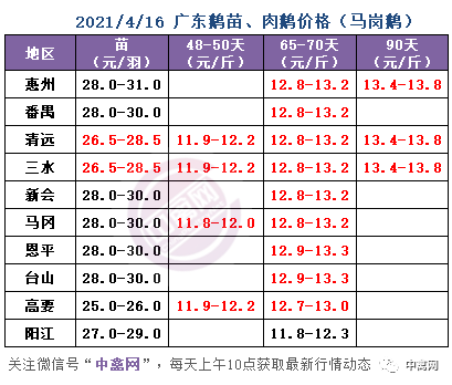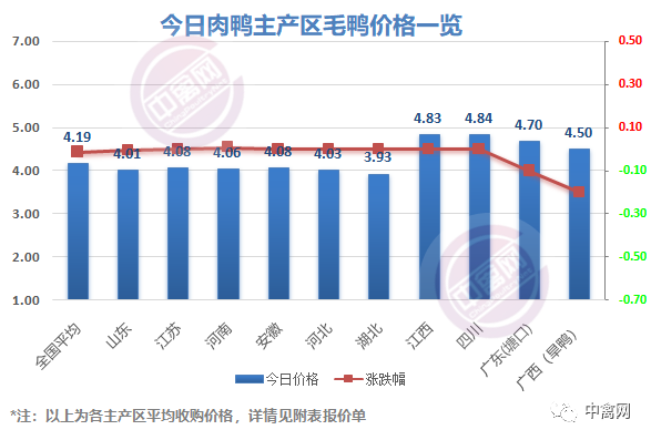 4月16日全国商品鸭出栏价格窄幅调整、乏善可陈。受集中出栏、及频繁降雨天气影响,进入4月后南方两广、江西、四川等地毛鸭出栏价格跌幅显著,本周粤桂两广虽有所反弹,但攻势较弱、今天两广大鸭收购价再度回落0.1-0.2元/斤不等。目前广东地区行情参考如下:白鸭主流成交参考4.6-4.8元/斤,麻鸭参考6.1-6.4元/斤,泥鸭棚头装车价参考5.7-6.0元/斤区间;广西方面各品种上车价较广东低0.2元/斤左右。(详情见附表)