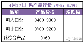 4月16日主产区重点监测规模冷藏企业白条、半鸭类出厂价格不动,主销分割及鸭副产品以稳为主,个别单品有零星调价。