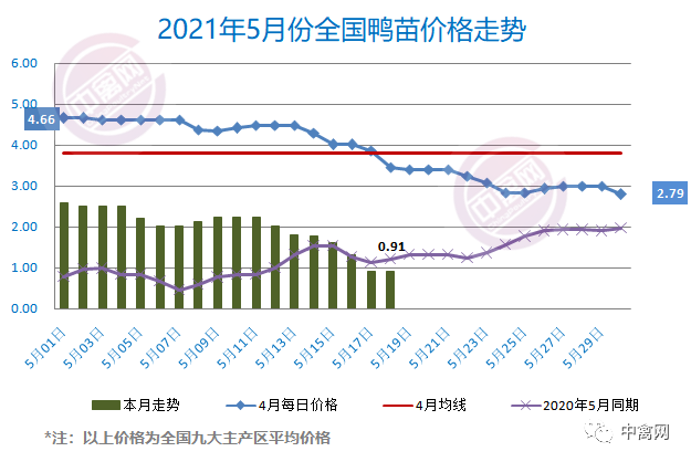 最新行情:明日上游端鸭苗、种蛋(品种:樱桃谷)行情谷底震荡、毛苗徘徊,各区域主流孵化厂家开票报价不动。经过上周以来的持续阴跌下调,华南两广、江西、四川等地实发价格先后跌破1元,毛苗行情再现。全国监测区域鸭苗成交均价0.91元/羽,较去年5月同期下跌0.35元/羽,跌幅27.8%,环比4月下跌2.90元/羽。
