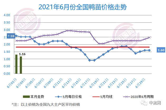 最新行情:明日上游端鸭苗、种蛋(品种:樱桃谷)行情二次探底、全线大跌。近期苗价震荡走弱,六月遭遇开门第二降,明天各区域主流孵化厂家开票报价普遍回落0.1-0.3元/羽,南方两广、四川等地毛苗再现。全国监测区域鸭苗成交均价1.16元/羽,较去年6月同期下滑1.18元/羽,跌幅47.8%,环比5月下跌0.52元/羽。