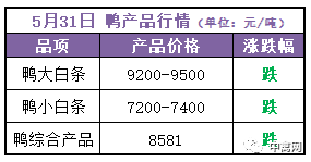 6月1日主产区重点监测规模冷藏企业白条、半鸭类出厂价格不动,近期生猪价格连创新低,叠加五一节后肉类消费清淡,部分鸭分割副产单品出厂价格小幅下调。经销商环节观望情绪加重,以消化库存为主,补货谨慎。